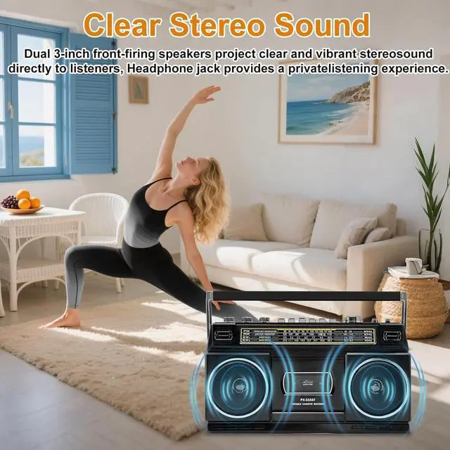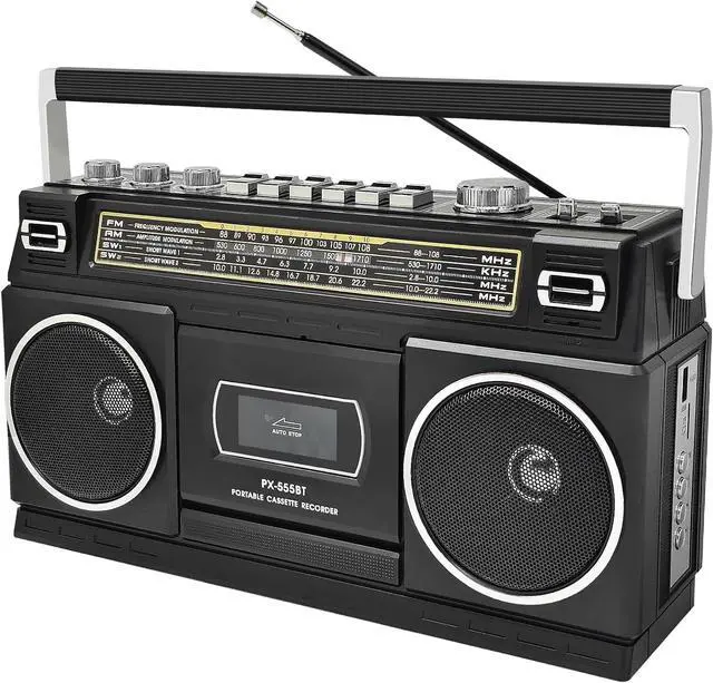 All-in-One Retro Audio Center with Bluetooth & RadioThis versatile cassette boombox blends vintage charm with modern tech. Stream music wirelessly via Bluetooth, enjoy AM/FM/SW radio broadcasts, or play your classic tapesall in a sleek, classic black design. ^^ Record & Preserve Your Cassettes to USB DigitallyOur standout feature! Easily convert your old cassettes to USB or TF card with the simple press of a button. Digitally archive your precious music mixes or recorded memories for lifelong playback and safekeeping ^^ Versatile Recording Studio & Powerful 24W SoundBeyond tape conversion, record via the built-in microphone or directly from Bluetooth audio.