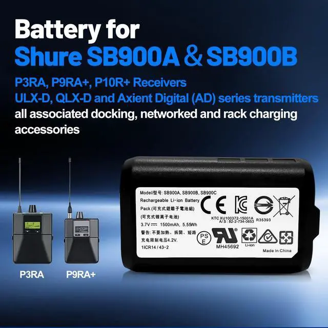 Compatible Device : Replacement for Shure battery models: SB900, SB900A, SB900B, SB900C. Compatible with: P3RA (PSM300), P9RA+ (PSM900) and P10R+ (PSM1000) Receivers, ULX-D, QLX-D and Axient Digital (AD) series transmitters and all associated docking, networked and rack charging accessories.