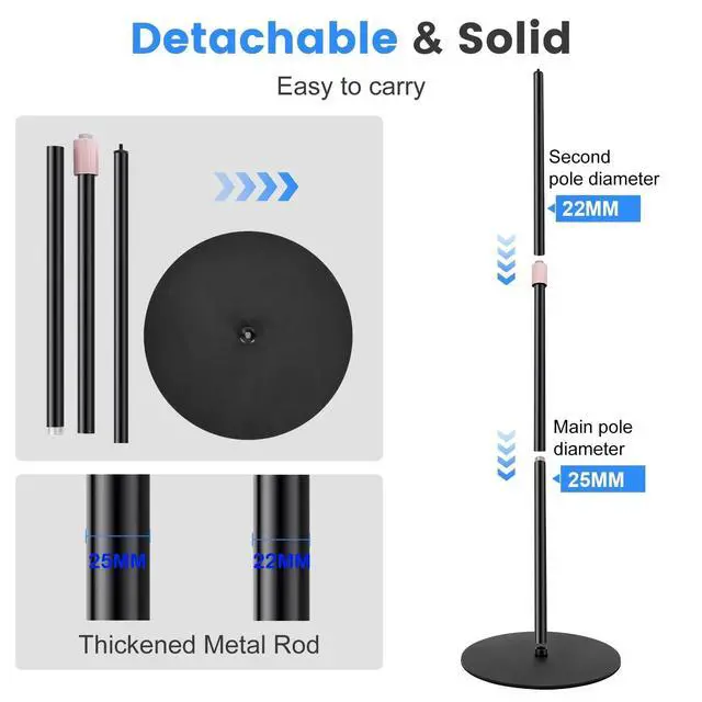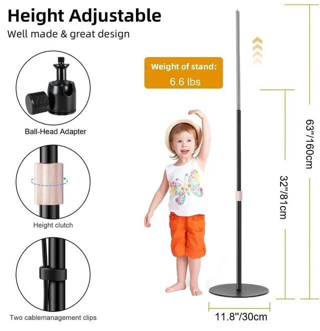 Height Adjustable: The height of this webcam floor stand is adjustable from 32 inches to 63 inches, easy to move without taking up desktop space. The perfect floor use Webcam stand for games, recording rooms, guitar playing, piano singing, live broadcasts, podcast etc. ^^ Stable Base & Sturdy Boom Arm: The weighted square base of the Webcam stand weighs 6.6 pounds, which is more stable and has a larger load-bearing capacity.