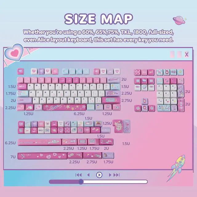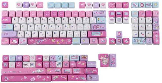 Digital Dreams: Pastel Y2K Keycap Set, a collaboration between KiiBOOM and Elyxirine. This set captures the iconic Y2K era with soft pastel colors and retro tech motifs like flip phones, chunky digital cameras, MP3 players, and pixel art. Perfect for anyone who grew up customizing their first phone wallpaper or jamming to a boombox, this keycap set brings a dreamy, nostalgic vibe to your keyboard. ^^ High-Quality 5-Side Dye-Sublimation PBTCrafted from durable PBT material, these keycaps feature 5-side dye-sublimation printing for vibrant, long-lasting colors that wont fade over time. The textured surface ensures a comfortable typing experience, while the high-quality construction guarantees resistance to shine and wear, even after prolonged use. ^^ MOA/Cherry Profile for Comfort and StyleThe MOA/Cherry profile offer a unique blend of ergonomic design and aesthetic appeal. With a sculpted shape that fits naturally under your fingers, these keycaps provide a comfortable typing experience while maintaining a sleek, modern look that complements any setup. ^^ Versatile CompatibilityThis 144-key set is designed to fit a wide range of keyboard layouts, including 60%, 65%, 75%, TKL, and full-sized keyboards.