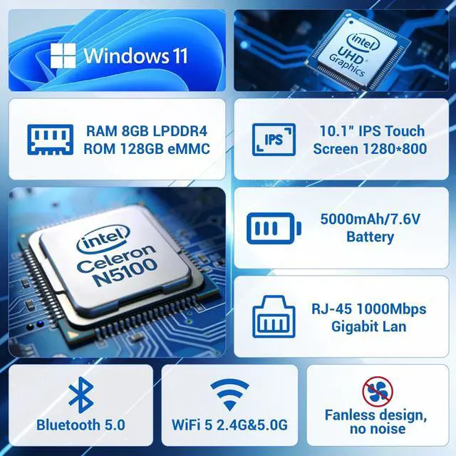 Windows 11 Pro Mini PC Computer-Powered by 12th Gen Intel N5100 (4C/4T, 4MB cache, up to 2.8GH z turbo), this compact touchscreen mini PC delivers seamless multitasking for home, office and industrial use. Featuring with 8GB LPDDR4 RAM, 128GB eMMC storage and pre-installed Windows 11 Pro, it ensures lightning-fast performance. ^^ 10.1 inch Touchscreen Mini Desktop PC-Experience crisp, vibrant visuals on a 1280800 HD IPS display. Featuring G+G 10-point multi-touch technology, this mini PC computer delivers ultra-responsive touch control-perfect for office tasks, industrial applications, and online education.
