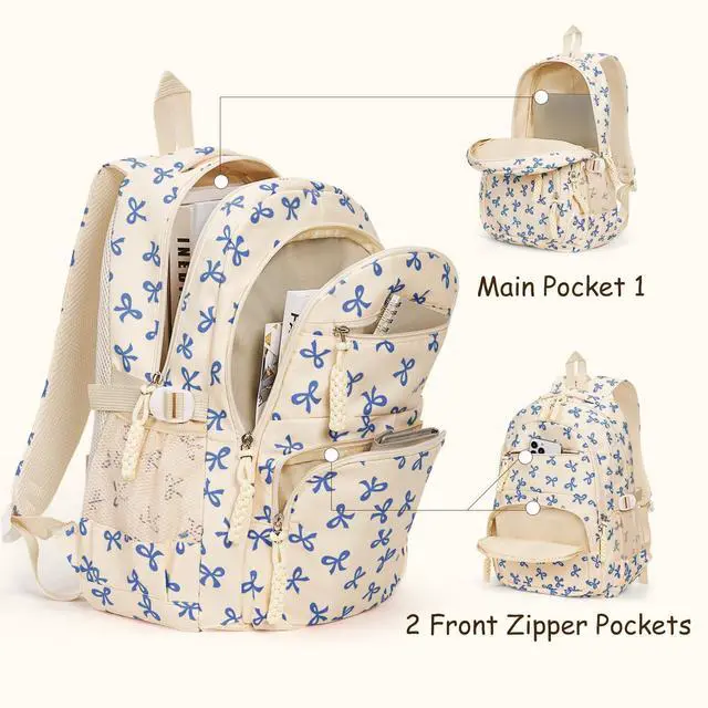 Nylon MaterialMade from solid nylon, this cute bow backpack offers a stylish and odorless design, combining both durability and a high-end feel. ^^ Comfortable CarryingThickened breathable shoulder straps + back cushioning pads disperse pressure and do not squeeze shoulders when carried for a long time. ^^ Functional StructureThis coquette backpack features a spacious main pocket for books, lunch, binders, and a large laptop compartment. Front pockets store keys, wallets, while side pockets fit water bottles or umbrellas.