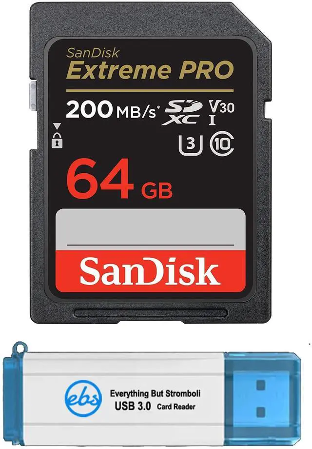 Bundle includes (1) 64 GB SD Extreme Pro SanDisk memory card and (1) Everything But Stromboli 3.0 SD and Micro Card Reader.