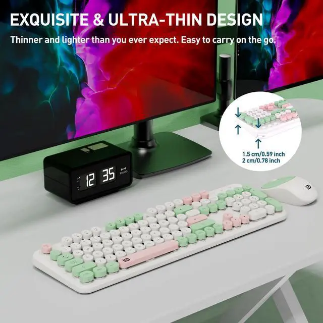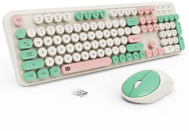 ATTENTION: wireless mouse and keyboard share one 2.4G hz USB receiver, it stored at the buttom of the mouse, plug and play. ^^ Full-Size keyboard with Ergonomic DesignThe typewriter keyboard wireless has colorful retro round keys and the silent click of the quiet mice will allow you to do your job without disturbing others. All circle buttons can be disassembled, put in water to clean. The typing key board is designed with a tilt angle, comfortable typing position. The cordless mouse is with modern ergonomic design,