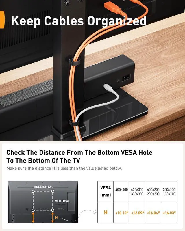 The TV stand mount can tilt up 8, the perfect solution for large TVs that may slightly lean forward, making it possible for you to get an optimal viewing without being restricted by the location. ^^ 9 Levels of Height AdjustmentThe TV table stand offers 9 height configurations with 3 installation positions on the column and 3 height choices on the brackets. Holds up to 70" TVs and soundbars with a screen center height of 24.6", this will give you more space to place your cable box, DVD player, sound bar. ^^ Install Swivel TV Base in 10 minutesThe TV stand with mount includes detailed instructions and assembly hardware for hassle-free installation in 10 minutes.
