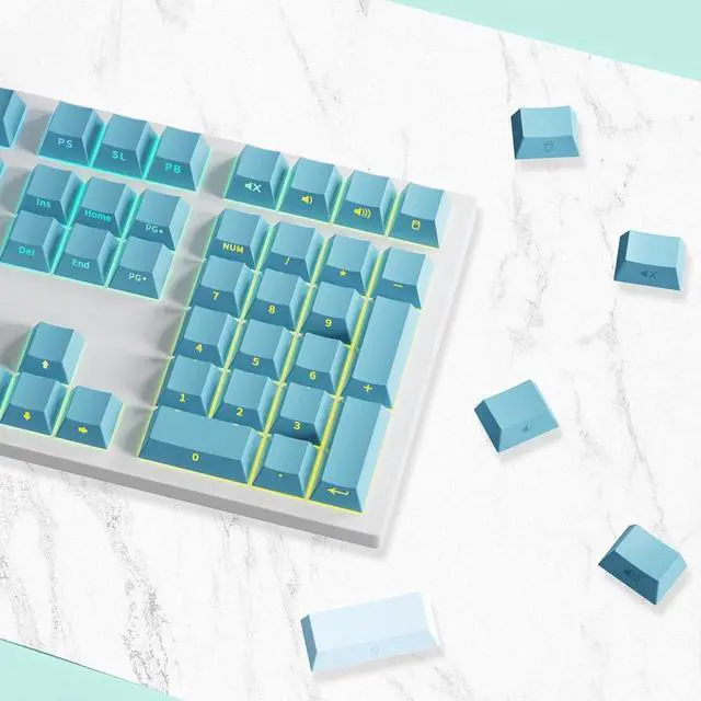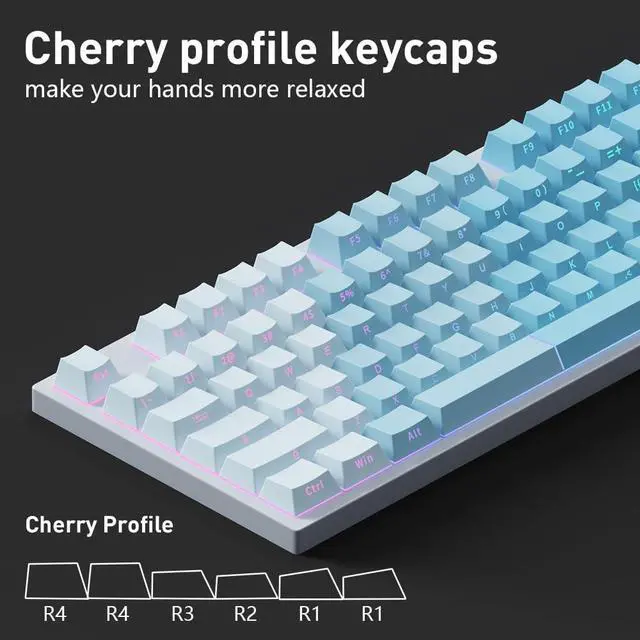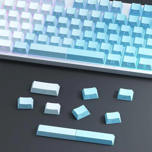 The stylish gradient blue colorway adds a vibrant and modern touch to your setup. ^^ Wide MX-Switch Compatibility Seamlessly compatible with the vast majority of mechanical keyboards using Cherry MX-style switches, including Gateron, Kailh, Outemu, and other MX popular clones. ^^ RGB Backlit Keyboards Specifically engineered to maximize the visual impact of your keyboards RGB backlighting. The side-lit design ensures legends remain and bright, transforming your keyboard into a stunning centerpiece.