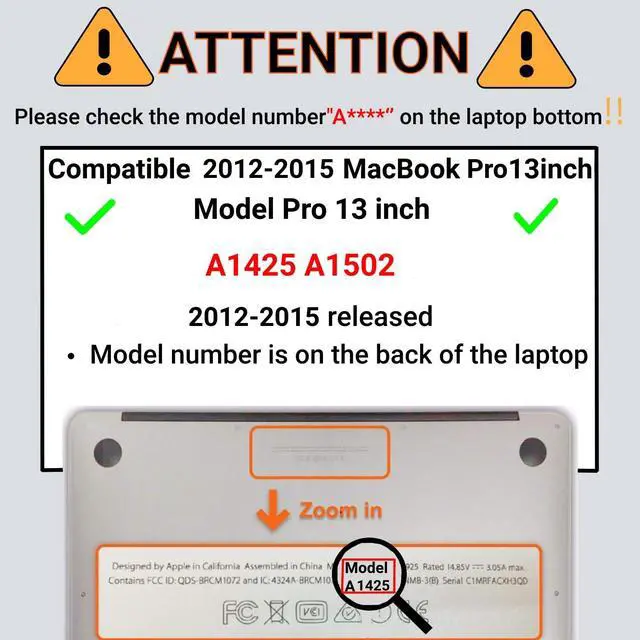 How to order the correct size protective case for your Macbook? Please check your Macbook model "AXXXX" at the back of the laptop. "XXXX" are numerical numbers. According to your Macbook model, please choose the same model at the size section. Model number location map is available at the picture section ^^ COMPATIBILITY - This case is only compatible with Model A1425/A1502 (Macbook Pro 13" with retina display, release 2012-2015). Macbook Pro 13" refers to the laptop display screen diagonal length is 13" or 13.3". Not the length of laptop. You can check Macbook model differentiation diagram at the picture section ^^ DIMENSION -