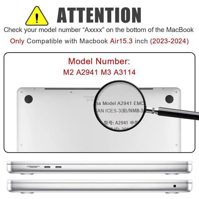 Check Your Macbook Model: Only compatible with MacBook Air 15 inch cover 2025 2024 2023 Release M4 M3 M2 Chip with Liquid Retina Display & Touch ID (Model: A3241 A3114 A2941). ^^ Please kindly check the model number "Axxxx" on the back of the laptop before your purchase, make sure you choose the exact model number: "A3241" "A3114" or "A2941" that compatible with MacBook Air15 inch M4 M3 M2 chip.