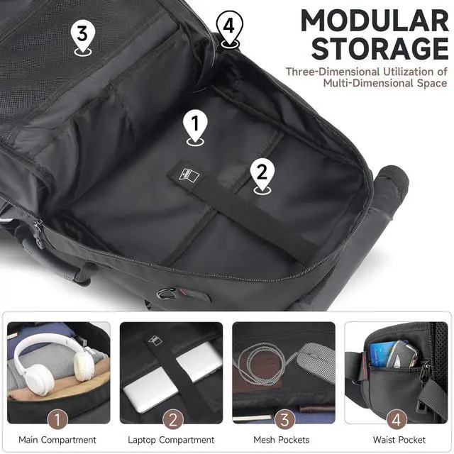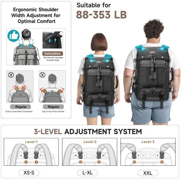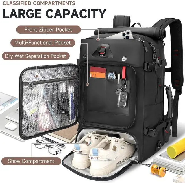 Heavy-Duty Travel Backpack: Durable & Water-ResistantCrafted from tear-resistant fabric with reinforced stitching; water-resistant coating protects gear in rain. Built for outdoor adventures, long trips, and daily uselasts through heavy wear without tearing. ^^ Spacious 50L Backpack with 17.3 Laptop & Separate Shoe Compartment Dedicated padded sleeve fits laptops up to 17.3; separate shoe compartment keeps dirty footwear away from clothes. Multiple organizer pockets neatly store travel essentials, hiking gear, and daily items. ^^ 3 Convertible Carrying Modes for Versatile Travel Easily switch between backpack, single-shoulder, and handheld carry. Padded adjustable straps, chest buckle, and waist support evenly distribute weightideal for hiking, camping, gym, and long-distance travel. ^^ Adjustable Comfort Fit for All-Day Wear 3-level height-adjustable & removable shoulder straps; ergonomic design fits broad/narrow shoulders. Breathable back padding reduces fatiguestay comfortable on all-day hikes, travel, or commutes. ^^ Built-in USB Charging Port & Side Water Bottle Pocket On-the-go USB charging port (power bank not included) keeps devices powered; stretch side pocket holds water bottles securely. Perfect for travel, hiking, and daily commuting.