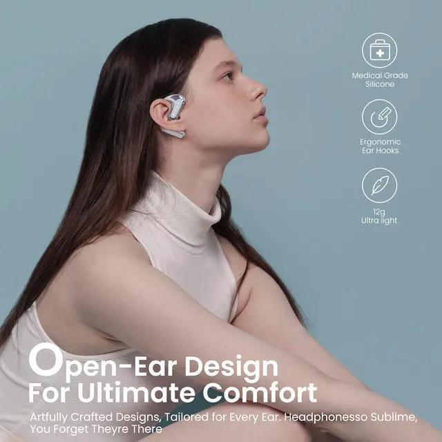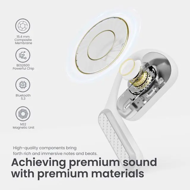 Innovative Open-Ear Design - The Earstereo 1 features an open design that doesn't directly enter the ear canal, preventing hearing damage even during prolonged wear. This design offers a wide soundstage and transparent sound, ensuring a natural and comfortable listening experience, allowing you to enjoy music while being aware of your surroundings. ^^ Exceptional Sound Quality - The Earstereo 1 is equipped with the intelligent BES2600 chip and a 15.4 mm high-power Biology Fiber Diaphragm driver, delivering crisp, bright highs and full, deep bass. Combined with the unique Sound Plus algorithm, it creates a deeply immersive listening experience, making every song exceed your expectations.