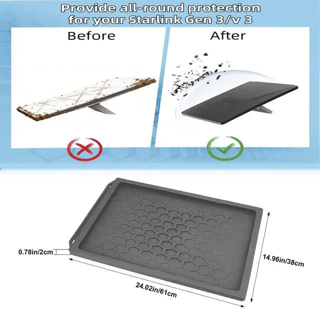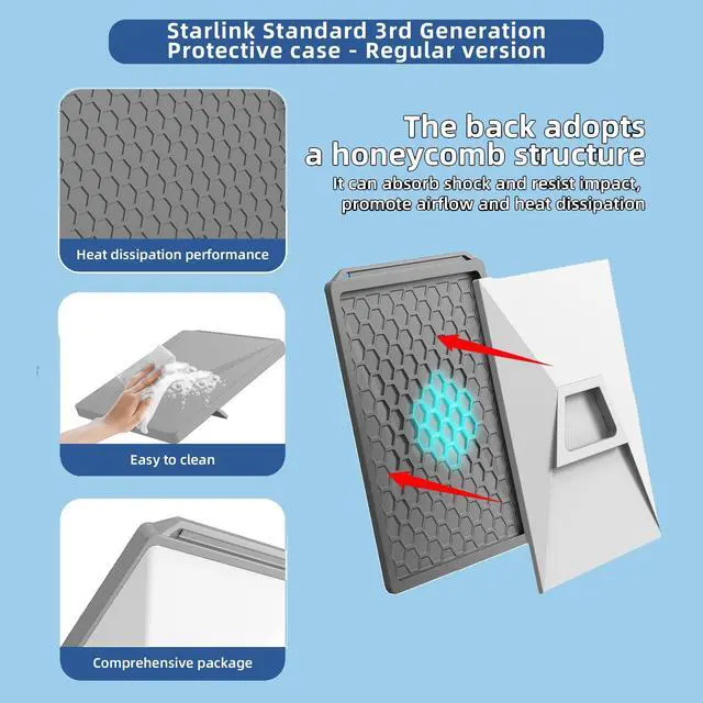 HONEYCOMB HEAT DISSIPATION STRUCTURE: Adopts 3D honeycomb heat dissipation structure with strategic vents. This innovative approach promotes optimal airflow and heat dissipation, effectively preventing your dishes from overheating during long runs and ensuring long-term performance. ^^ IMPACT AND SCRATCH PROTECTIONThe Starlink Standard Gen 3 case is made from premium silicone material that is extremely durable, flexible and soft to the touch. It has excellent shock-absorbing properties, effectively preventing Starlink gen 3 from being damaged by scratches, dust, and impacts. ^^