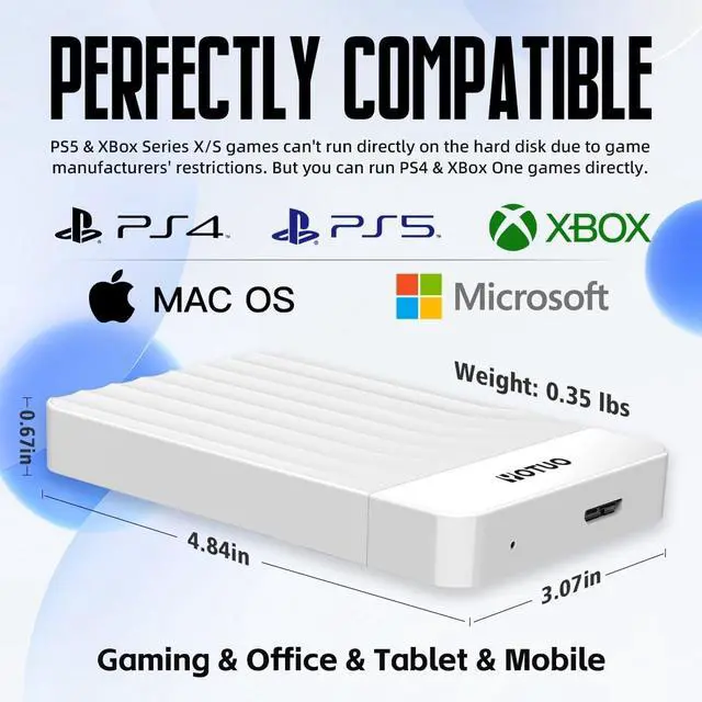 Plug and play for home and office equipmentYOTUO HDD01 USB 3.0 external hard drive. Suitable for Windows XP/2003/Vista/7/8/10/11, Linux, Mac OS system. As well as laptops, desktop computers, PS4, PS5, XBOX 360, XBOX ONE, XBOX series X/S and other office equipment and gaming equipment. The product is plug-and-play when used in Windows. For Mac users, first format the drive and select the ExFat format. ^^ The first time you use this product in your gaming device, you will need to install an external hard disk into your gaming deviceXBOX Simply follow the steps prompted by the system pop-up window to use it in the device.