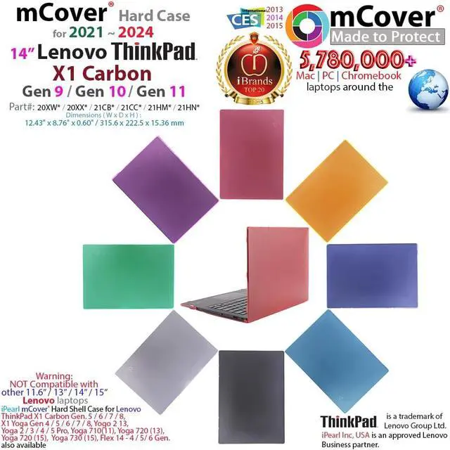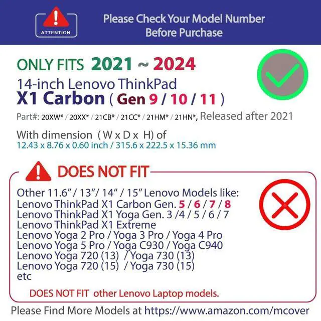 NOTE: Before placing order, PLEASE make sure to verify your laptop model number as this case is MODEL specific and NOT interchangeable. ^^ NOT fitting other 14-inch Lenovo ThinkPad X1 Yoga or X1 Carbon series laptops. NOT compatible with ANY other Lenovo or non-Lenovo laptops as well. ^^ Made of high-quality translucent polycarbonate material which is shatter-proof and will protect your 2021 - 2024 14" Lenovo ThinkPad X1 Carbon Gen 9 / Gen 10 / Gen 11 series (with 180-degree hinge) notebook all around ^^ Designed to perfectly fit the 2021 ~2024 Lenovo ThinkPad X1 Carbon Gen 9 / Gen 10 / Gen 11 series with Dimensions (Width x Length x Height) of 12.43 x 8.76 x 0.6 inch ( 315.6 x 222.5 x 15.36 mm ) ^^ 2-piece light-weight ( 8.7 oz or 247 g ) shell easily snaps on and off.