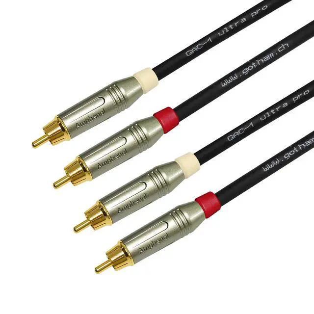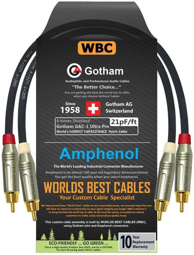 Custom Made 1.5 Foot - RCA cable pair made using Gotham GAC-1 Ultra Pro (Black), Premium Linear Crystal Oxygen Free Copper (LCOFC), Low-Capacitance (21 pf/F), Dual-Shielded, Audio Interconnect cable, terminated with Amphenol ACPR - Die-Cast Body, Gold Plated RCA Connectors (White and Red color boots) (this sale is for a pair of cables for left and right channels, each cable is 1.5 Foot long).