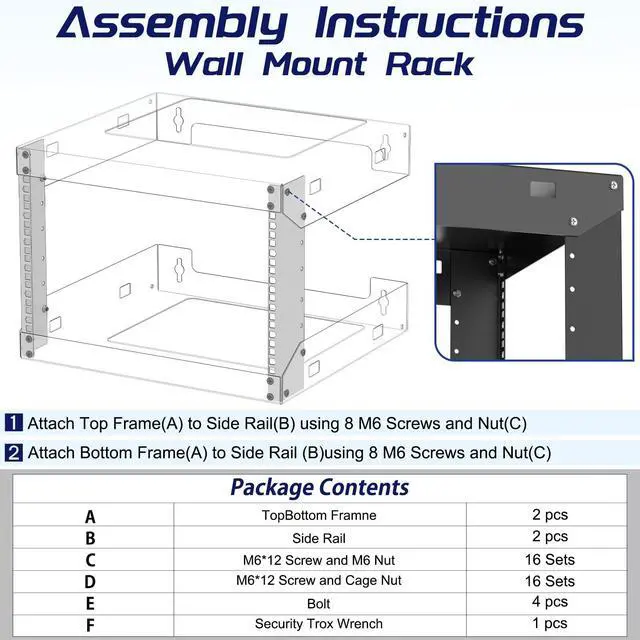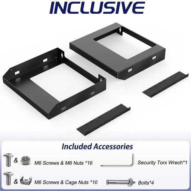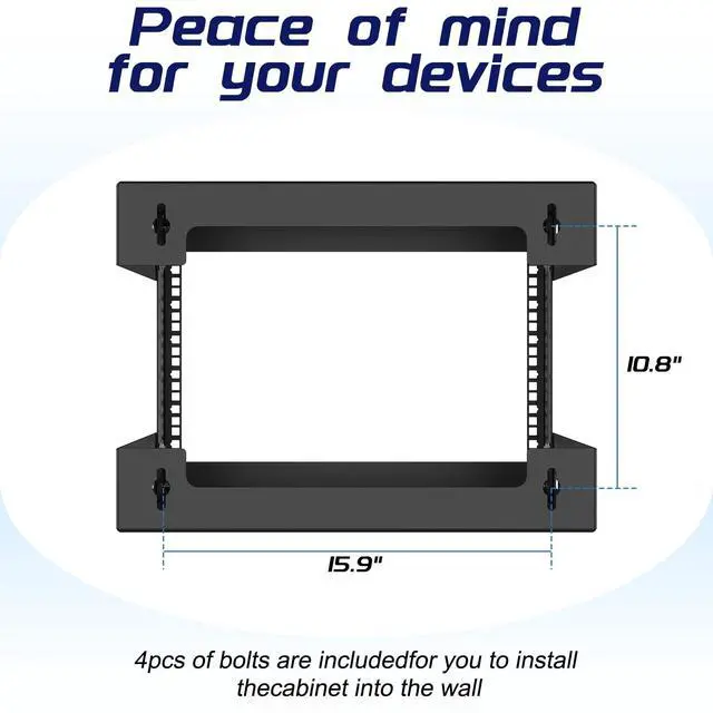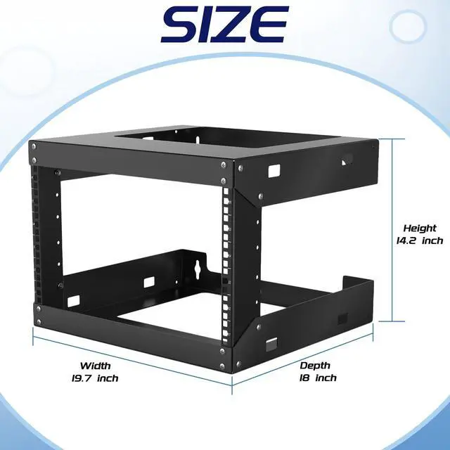 Frame Dimensions: 19.7" W x 18" D x 14.2" H ^^ Heavy Duty - Open rack constructed with heavy-duty steel material, supporting up to 230 lbs of equipment; powder coating ensures effective rust and corrosion protection ^^ Easy Equipment Configuration - The 6U network rack features an open design that optimizes airflow circulation, facilitating easy access to equipment and cabling ^^ Application - 6U wall mount rack is suitable for 19-inch-wide electronic equipment and devices, such as audio-visual equipment, data equipment, servers, network routers, switches, computer equipment, and gaming consoles equipped with rack shelves ^^ Optimize Storage Space - Wall mount rack open frame supports wall-mounted devices, creating a more efficient and convenient operating environment