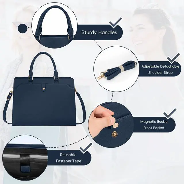 The main compartment features a thick padded sleeve with anti-collision foam and a secure velcro strap at the top to keep your device in place, providing all-around protection during commutes or travel. Perfectly sized to carry your laptop, tablet, and all daily essentials with ease and style ^^ PREMIUM MATERIAL & WATERPROOFThe briefcase for women is crafted from premium soft PU leather, the waterproof PU leather material protects the device from spills and makes cleaning easy and convenient. The sturdy gold hardware makes the PU bag more stylish and durable; the smooth top zipper closure design ensures that your belongings are safe and secure; the bag is also equipped with metal foot pads at the bottom to protect your briefcase from scratches ^^ REMOVABLE & ADJUSTABLE SHOULDER STRAPReinforced Adjustable Straps design offers two carry ways, can be used as a tote or a shoulder bag.