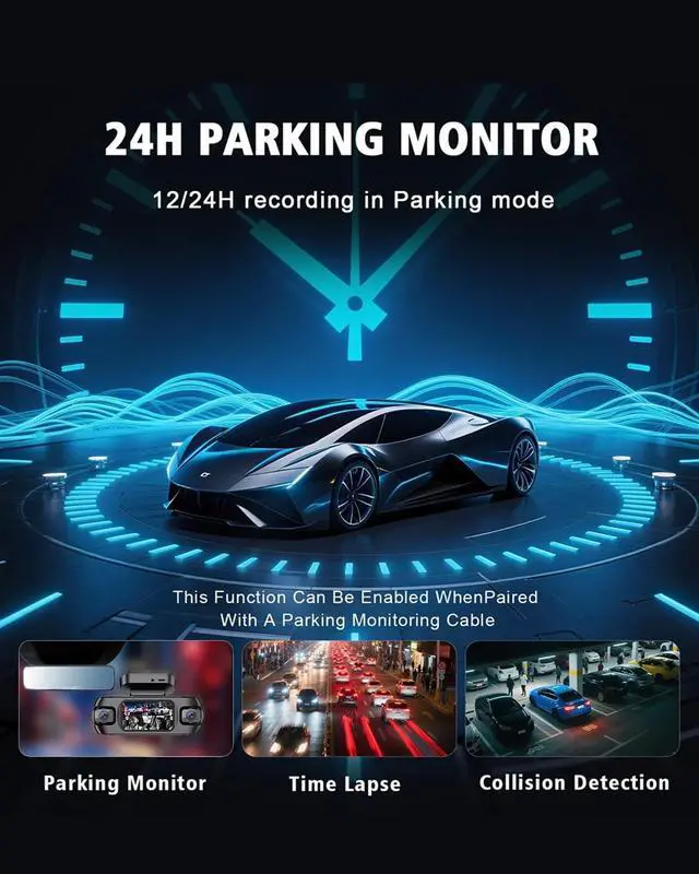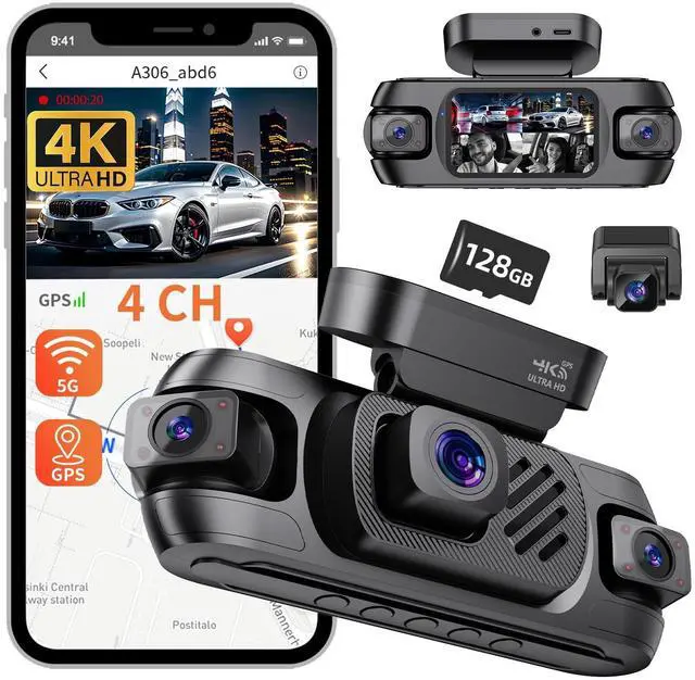 With built-in 5G WiFi, instantly view, download, and share videos directly to your phone via the appno cables or delays. ^^ Built-In GPS, G-Sensor & Loop Recording with FREE 128GB CardDrive with confidence. Our 4-channel dash cam features built-in GPS that embeds your route, speed, and location directly onto video. The G-Sensor automatically detects collisions and locks crucial footage to prevent overwriting. Includes FREE 128GB card - ready to protect you immediately after installation. ^^ 24/7 Parking ProtectionSafeguard your vehicle around the clock. When hardwired (kit sold separately), our dash cam auto-activates parking mode when parked.