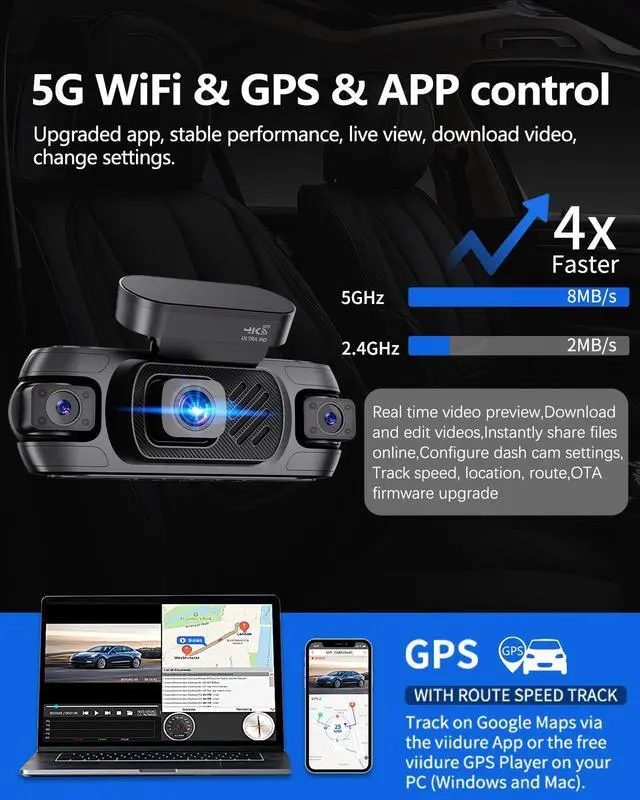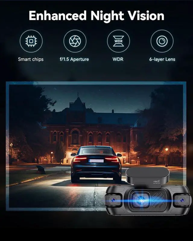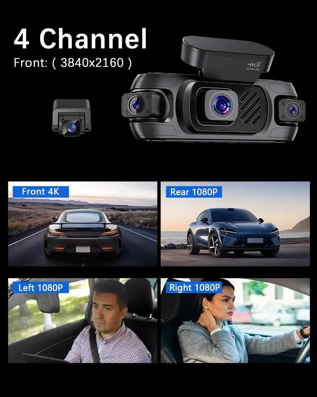 360 4K 4 Channel Dash CamDrive confidently with Zunfly W9 4 channel dash cam. Features 4K front lens, 1080P rotatable interior/rear cam, and dual side cams to monitor front, rear, cabin, and both sides. Achieve true 360 coverage that eliminates blind spots while capturing license plates and critical details with exceptional clarity. The complete dash cam front and rear solution for your car, SUV, or truck's security. ^^ Crystal-Clear Night Vision & Built-In 5G WiFiNever let low light compromise your safety. Our dash cam features F 1.8 aperture, WDR, and Night Vision tech to automatically balance exposure, capturing clear footage in dark environments.