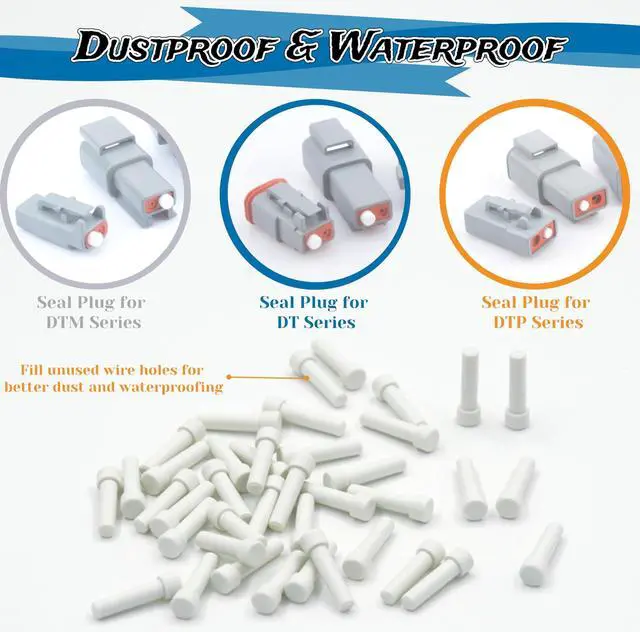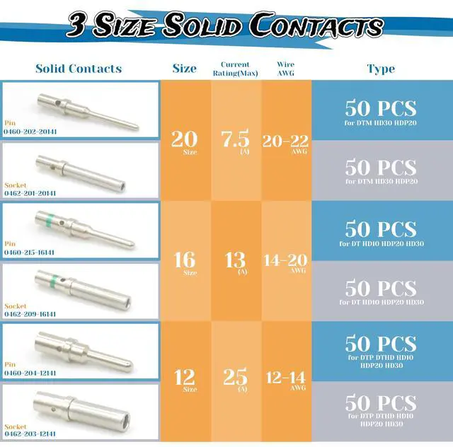 Ultimate 3-in-1 Deutsch DT Contacts Bundle This comprehensive kit includes 50 pairs of Size 16 DT contacts (0460-215-16141 / 0462-209-16141), 50 pairs of Size 20 DTM contacts (0460-202-16141 / 0462-201-16141), and 50 pairs of Size 12 DTP contacts (0460-204-12141 / 0462-203-12141). Plus, it comes with 30 seal plugs (114017) for complete cavity sealing.