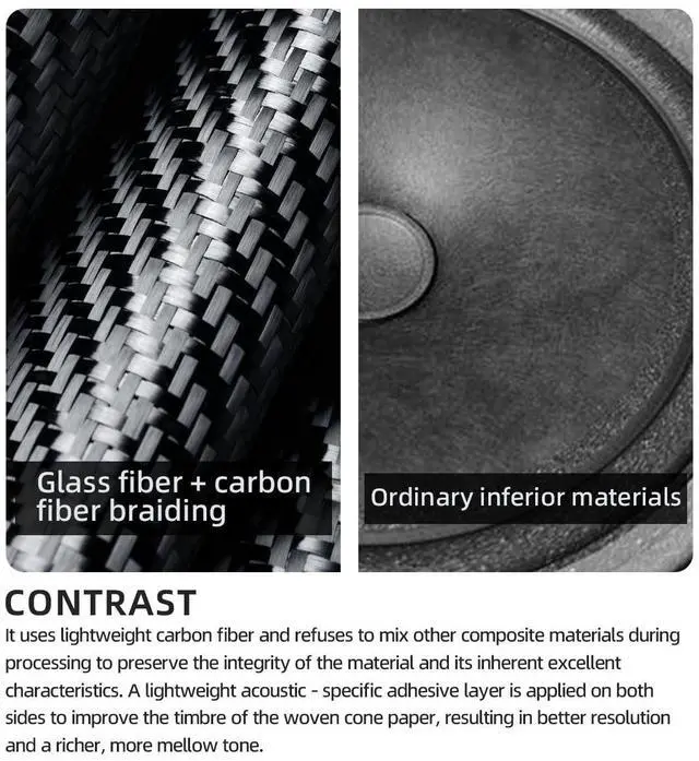 PRO AUDIO BASS SPEAKERSRevolutionize your car audio with the 6.5" Carbon Fiber Subwoofer. Engineered with aerospace-grade materials, this speaker delivers earth-shaking bass down to 65Hz while maintaining crystal-clear midrange, perfect for hip-hop, EDM and competition sound systems. ^^ PURE CARBON FIBER CONSTRUCTIONFeaturing a yellow carbon fiber cone with acoustic-specific adhesive coating, the provides lightning-fast transient response and zero distortion. The all-carbon design preserves material integrity for studio-quality sound reproduction that outperforms composite cone speakers. ^^ MILITARY-GRADE COMPONENTSThe SV pure copper voice coil with TIL former handles 1000W max power (150W RMS) without overheating, while the Y35 ferrite magnet delivers 30% stronger magnetic flux than standard magnets for explosive bass response.