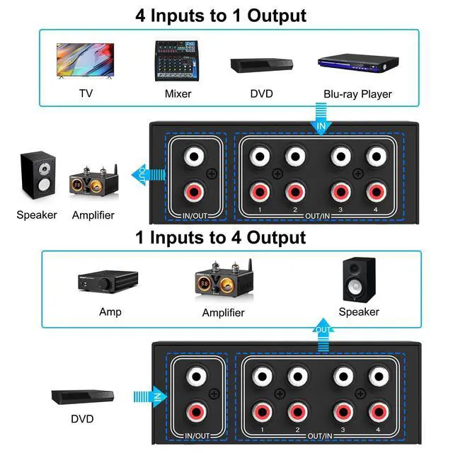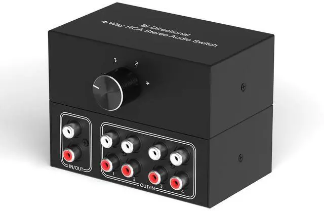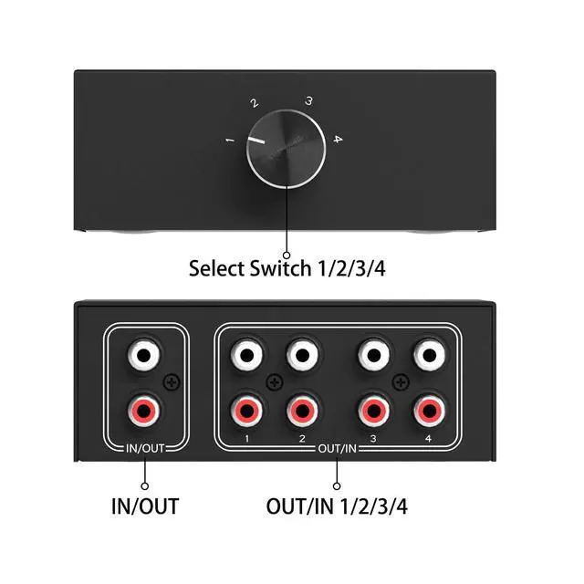 L/R audio selectioner: up to 4 audio sources can be connected to a stereo speaker or 1 audio source to 4 stereo speakers to switch.