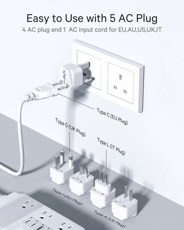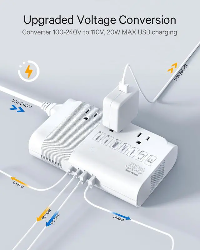 Converter & Travel Size: Converts voltage in different countries from 100V-240V to the USA standard 110V. Its compact and small size ( 6.3 x 4.3 x 1.6 inches) allows for easy packing in your luggage case. ^^ [Use US Power Worldwide] DOACE voltage converter kit equips 1 EU power cable and 4 international adapters (UK, US, AU, IT). Converts all countries' voltage 100V-240V (60/50Hz) to US Pure Sine Wave voltage 110V (60Hz). So you can use your US devices in more than 160 countries, such as the UK, Europe, Italy, Australia, Italy, Japan, China, etc. Even in US, you can use it as a power strip. ^^ [7-1 Fast Charging] DOACE Power Converter features 7 charging ports, including 3 sockets and 4 USB ports. It can charge 7 devices simultaneously at 350W. USB includes 2 PD 20W fast charging USB-C ports and 2 QC 18W fast charging USB-A ports. In addition, USB outputs are completely isolated from AC power for safe device operation. ^^ [Travel Essential] DOACE travel power converter has a compact size ( 6.341. 57 in/ 1.4 pounds) and 4-foot power cable for convenient packing and use.