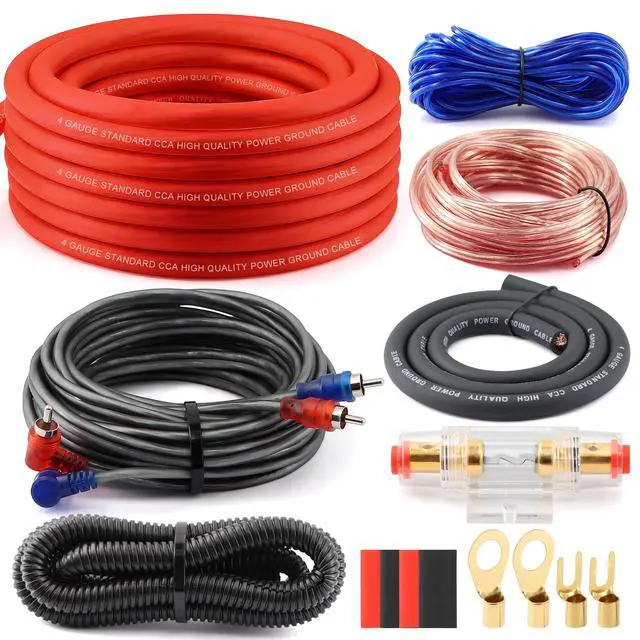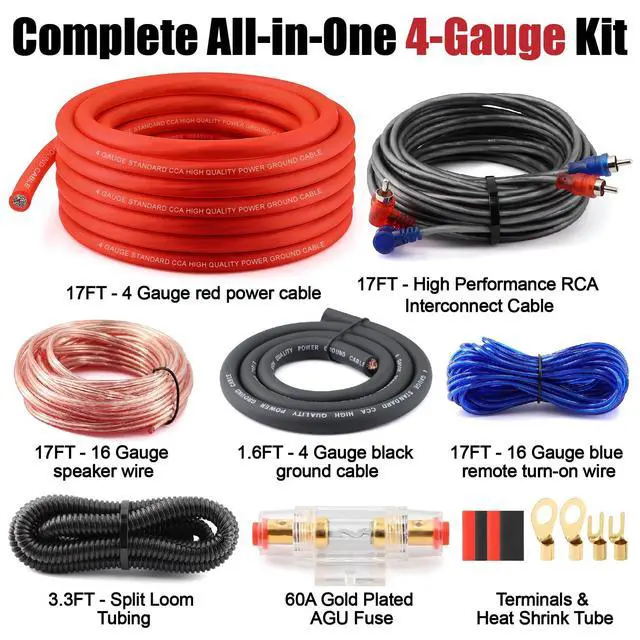 Complete All-in-One 4-Gauge KitThis kit includes everything you need for a full amplifier installation: a 17ft Red 4gauge power cable, 3ft High-Performance CCA ground wire, 17ft Blue remote turn-on wire, 17ft High-Performance RCA interconnect cable, and a 17ft speaker cable. All wires are plenty long to meet your installation needs. ^^ Built-in Safety ProtectionProtect your investment with the included Gold-Plated AGU In-Line Fuse Holder, equipped with a 60A fuse (maximum current rating). This essential component automatically protects your audio system from damage caused by overload current, ensuring worry-free operation. ^^ High-Performance ApplicationEngineered for systems up to 1000W, this kit is ideal for powering subwoofers and multi-channel amplifiers. It ensures your amplifier receives clean, consistent power, eliminating common issues like audio dropouts and distortion. ^^ Premium Material & ConstructionFeatures a premium 3ft (CCA) ground wire for superior conductivity and long-term reliability. The kit also includes top-quality construction materials, such as strong rubberized sleeves and rubber couplings, ensuring a clean and durable installation. ^^ Easy & Professional InstallationDesigned with the user in mind, this kit is very easy to install. The flexible, generously long wires can be routed through tight spaces with ease.