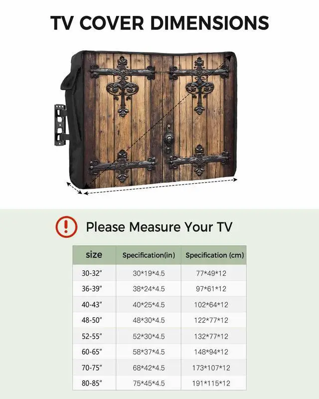Size for Choose: 30x19x 4.5 inch, for 30-32 inch TV28x24x 4.5 inch, for 36x39 inch TV40x25x 4.5 inch, for 40x43 inch TV48x30x 4.5 inch, for 48x50 inch TV52x30x 4.5 inch, for 52x55 inch TV58x37x 4.5 inch, for 60x65 inch TV68x42x 4.5 inch, for 70x75 inch TV75x45x 4.5 inch, for 80x85 inch TVPlease confirm your TV size before making a purchase. -- This outdoor tv covers weatherproof can well protect your TV from the rain, sunlight, UV rays, wind, snow and outdoor elements and helps keep the dust off and the screen clean. --This tv covers outdoor has slits and opening area in the back so the wall mount arm can fit through, the slit areas have hook and loop to seal up ensures durability and longevity compared to zippers, easy to install and take off. -- A side pocket on both sides of waterproof tv cover for outside to store your remote control, it can well protect the remote control and you can easily access it when you need it. -- This tv protective cover is easy to care for, machine washable with cold water, gentle cycle.