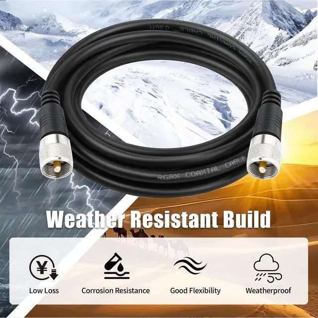 This RG8x coax cable is used for CB ham radio, antenna analyzer, tuner, switch, monitor, dummy load and SWR meter, it is also great for Jeep Wrangler CB installation. ^^ The 25ft/ 7.6 m CB antenna cable has UHF PL-259 male to male plug, nickel-plated connectors which are fully molded. ^^ The braid shield is made of 128x 0.12 mm aluminum wire which made this jumper cable is really low loss and maximum protect the signal during the transmission. ^^ Better than RG58, RG8x coax cable has 17AWG thicker pure copper inner conductor, is a step up from standard RG-58 coaxial cable and is recommended for high-powered applications or users who simply want the best coax possible.