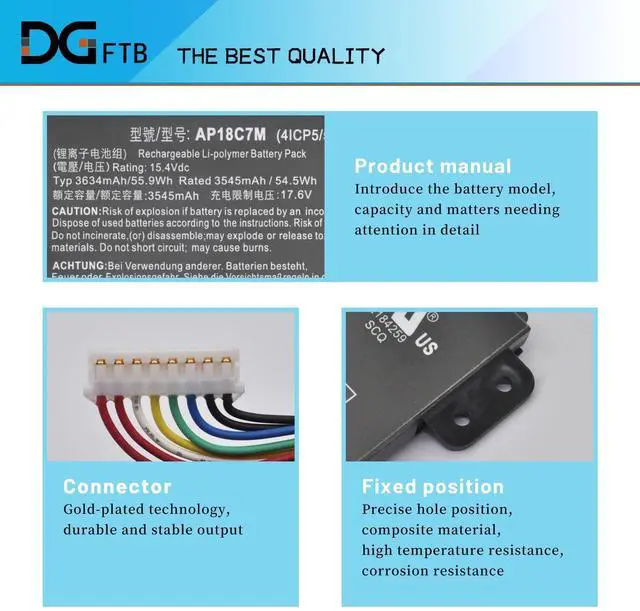 Capacity: 55.9W h/3634mAh ^^ Compatible P/NAP18C7M KT00407008 4ICP5/57/79 ^^ Compatible Modelsfor ACER ConceptD 3 CN315-72 Series; for ACER Spin 5 SP513-54N SP513-55N Series; for ACER Swift 3 SF313-52 SF313-52G Series; for ACER Swift 3 SF514-55T SF514-55TA Series; for ACER Swift 5 SF514-54GT Series; for ACER Swift 3 SF313-53 SF313-53G Series; for ACER Swift 5 SF514-54T Series; for ACER Swift 5 SF514-55GT SF514-55T Series; for ACER Swift 3 SF316-51 Series; for ACER Swift 5 SF514-56T Series; for ACER Swift X SFX16-52G Series Notebook. ^^ DG QualityGrade A cells mitigate the risk of battery leakage and maximize output stability. Built-in circuit protection, enhances safety of usage and extends battery life ^^ DG TIPSFor the initial installation, please reinstall and check the interface fully connected, discharge the battery to 5%(not to 0%) and then charge to 95%, and cycle 3-4 times