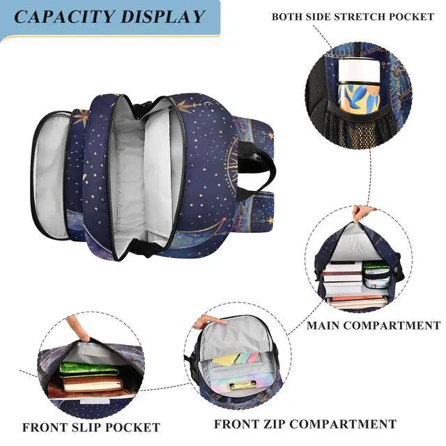 ^^ Multiple storage compartments: double zippers Large Main Compartment (include Separate Laptop Compartment, fits under 15.6 Inch Laptop. The compartments provide room to carry books, electronics accessories, A4 paper, binders, change of clothes). The Front zipper compartments provides a separate space for your smaller school supplies. There also has a small transparent compartment. Front slip pocket can hold pen, keys, wallet and more. two mesh water bottle, also fit an umbrella. ^^