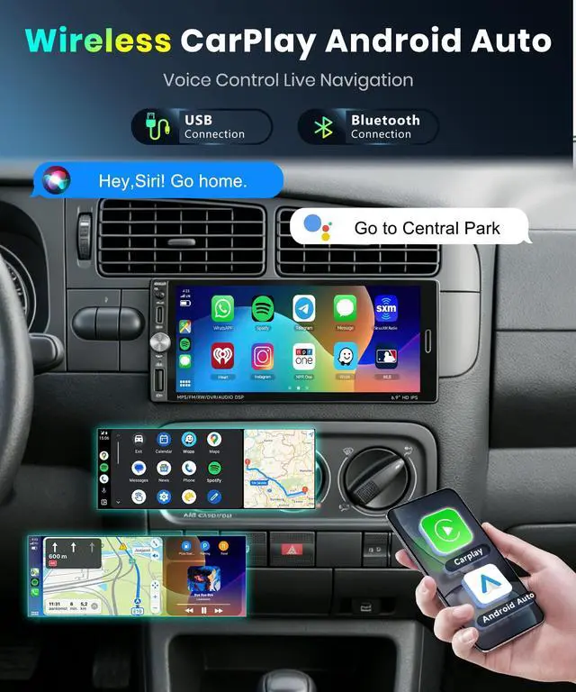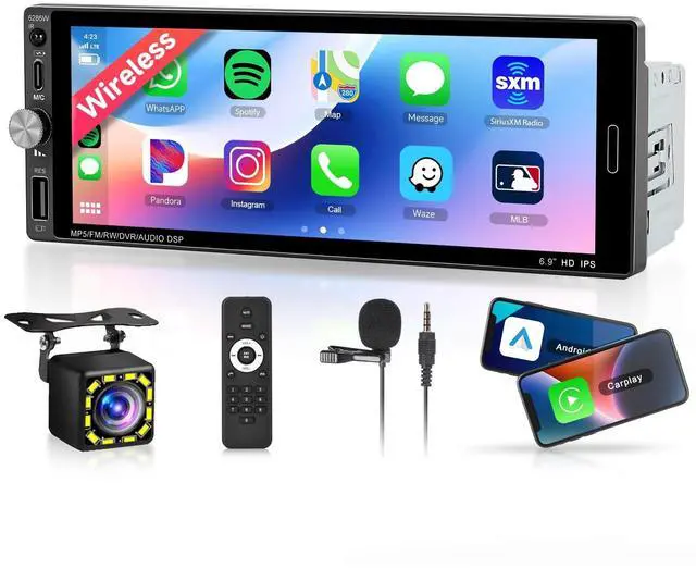 6.9 inch Single Din Car Stereo Head Unit This single din car stereo supports wireless carplay and android auto. Car Audio head unit features Type-C/USB/U Disk interfaces and 7 colorful lights. Before purchasing, please check the size compatibility with your car console. Feel-free to contact-MAHVEC if you have any questions ^^ Wireless Carplay & Android Auto This single din radio supports Wireless Carplay and Android Auto via bluetooth connection. On the 6.9 -inch touch screen, you can enjoy a variety of mobile apps like Waze, Spotify, YouTube Music, News, etc.
