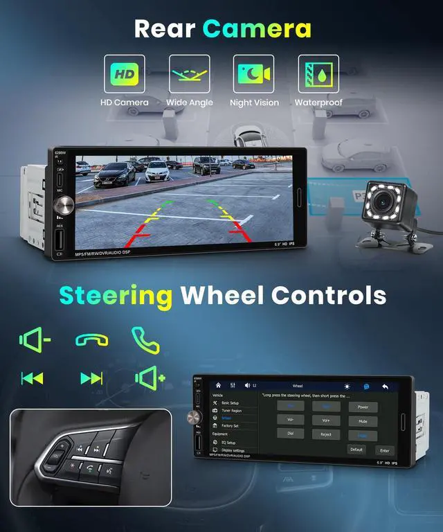 EQ deliver various music effects: Vbass, Balance, Emperor, Filter, Loudness, etc ^^ Steering Wheel Controls & 12LED Backup Camera This 1 din touch screen car stereo supports SWC, including song/channel switching, volume adjustment, call answering, etc. The car stereo with a backup camera features HD 170-degree and IP67, waterproof and dustproof, providing a clear view whether at night, in rainy, foggy, or dusty weather ^^ 7Color key light & Outer Interface Multi-function USB &TYPE-C portallow you to connect your devices and enjoy your favorite music, videos, and photos. Single din Head Unit Outport support various formats and Fast charging. Enhanced with a 7-color button light, it ensures visibility even in the darkest settings ^^ RCA Output& Mirror Link The wireless carplay car stereo connect with RCA, support car headrest video output, your family or friends could enjoy videos in the backseat. The 6.9 -inch 1080P IPS touch screen enables you to enjoy various mobile apps and use the mirror link function to watch videos
