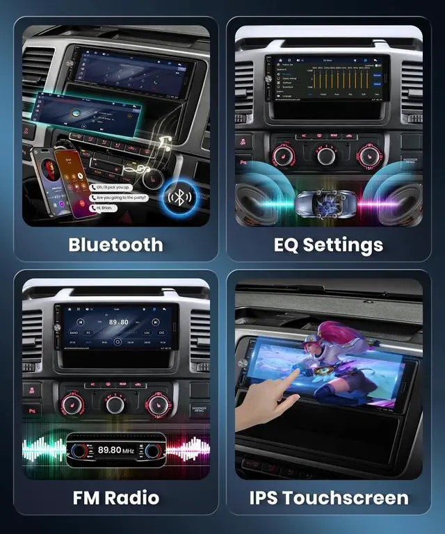 Via carplay or android auto, you can use GPS, music playback, send messages, and more functions ^^ 5.2B luetooth & FM Radio & EQ Bluetooth 5.2 enables fast and stable pairing for music and contact syncing. This bluetooth car stereo supports music playback, hands-free calls, and phonebook access. FM Radios allows you to listen to radio stations, providing various music, news, etc.