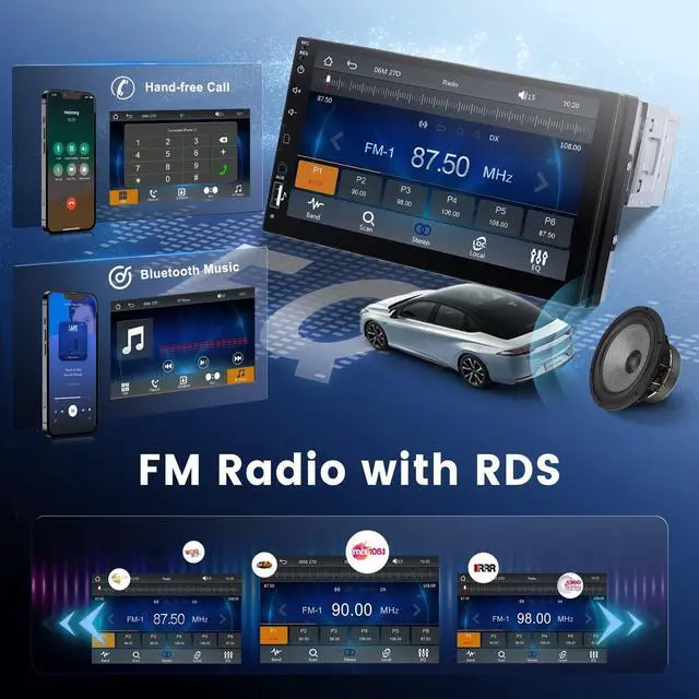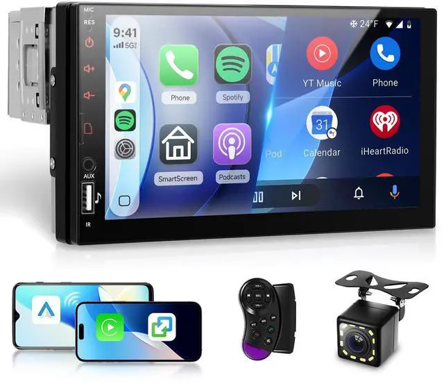 Carplay/ Android Auto: iOS/Android Phones connect via bluetooth or USB. Support iOS and Android phones mirror link, to sync your smartphone to the big screen ^^ Bluetooth & FM Radio ReceiverCar stereo 1 Din is built-in microphone supports Bluetooth A2DP hands-free calling, Bluetooth music playback, and automatic loading of the phone book. It supports listening to radio, weather forecast, real-time road conditions, etc. through FM radio, with 18 preset stations ^^ Steering Wheel ControlThis car stereo single din support original steering wheel button study (Not support cars need a canbus). Rear view Camera InputCar radio with backup camera, we provide a waterproof night vision camera in our package. After connected to camera, when you pull the reverse gear, the device will show rear view image automatically ^^ Multiple FunctionsSupport USB(compatible with a variety of U disk, can charge for mobile phone), SD Card Slot (for additional storage. Easily store music, videos, and navigation maps with quick data access), EQ setting (multiple EQ modes, treble and bass can be adjusted). Support 1080P full format; Brightness adjustment, support driving recorder (not included), 18 sets of UI theme wallpapers to choose from