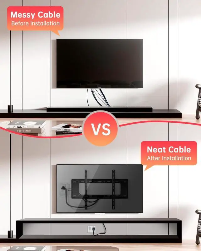 Management Bracket: It comes with two types TV cord hider, one for power supply with 2 ports of 3 prong outlet and other cables run through ways for HDMI Cable, RCA Cable, Coaxial Cable, and more. Otherwise is for connecting external power for power transfer for your mounting TV designed by 90 degree to meet your installation requirements. ^^ Safety