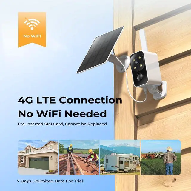 LTE Connectivity & Unlimited Data: SEHMUA Cellular Security Camera Works with factory-installed SIM card for WiFi-free monitoring in remote areas (farms, RVs, construction sites, cabins). Includes 7-day unlimited data trial, subscription required thereafter ($ 19.9 /month).