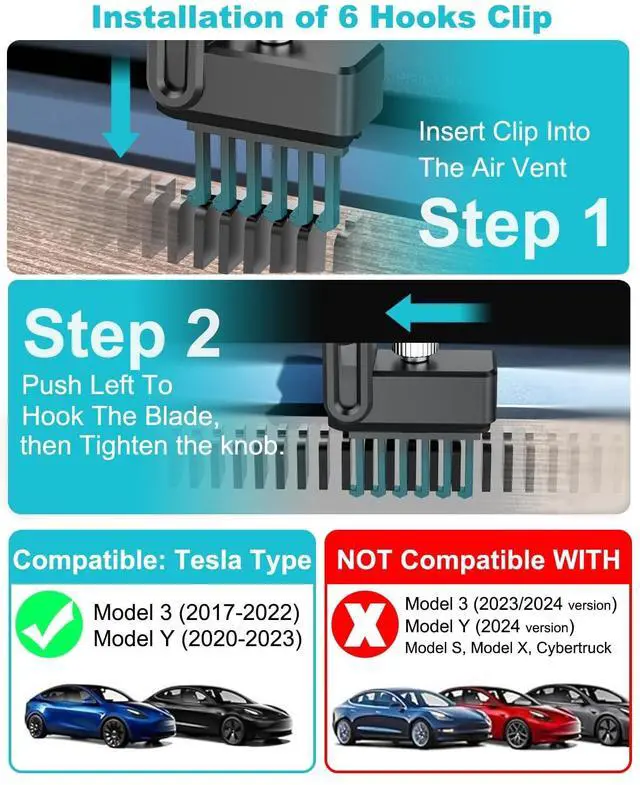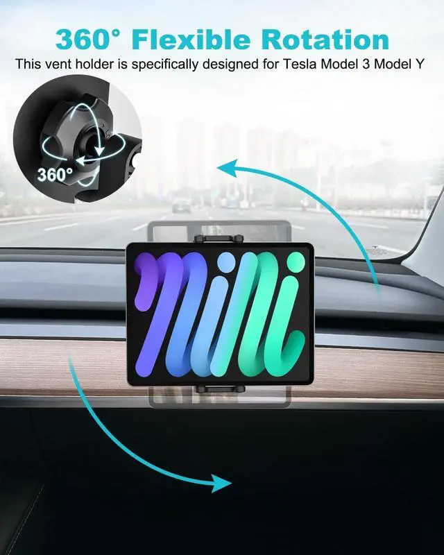 IMPORTANT: Please pay attention to your Tesla model before purchasing. This holder is NOT COMPATIBLE with 2023 Model 3, 2024/2025 Model 3, 2024/2025 Model Y, Model S, Model X, Cybertruck. This Holder is compatible with 2017 to 2022 Model 3, 2020 to 2023 Model Y. ^^ 360 Flexible RotationTesla Model 3/Y Tablet Mount uses a ball-socket type, offering 360 degree angle adjustment function. You can easily adjust a perfect viewing angle with one hand - horizontal mode & vertical mode - For a better user experience, avoid tilting your neck and say goodbye to troublesome neck problems. ^^ Tesla Travel Road Trip EssentialsThe Tesla tablet holder is specially designed for the co-pilot, which is the perfect savior from boredom on long or short road trips. Co-pilot Tesla tablet holder allows passenger to watch movie, play game, read e-book, etc. during long journeys. It not only allows co-pilot passengers to have unprecedented fun, but also allows passengers to avoid neck fatigue and arm injuries caused by holding the tablet for a long time. ^^ Anti-Shake 6 Hook Vent ClipTesla tablet vent cradle adopts a "6-hook" design, which greatly increases the stability during driving and can stably support your tablet even on rough roads.