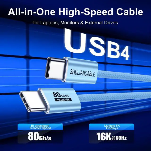16K@60Hz & Dual 8K DisplaysUSB 4 Data Cable supports single-display 16K@60Hz or dual-display 8K@60Hz output, delivering an immersive visual experience. Perfect for connecting laptops or docking stations to monitors for presentations, video playback, and gaming on large screens.