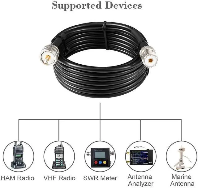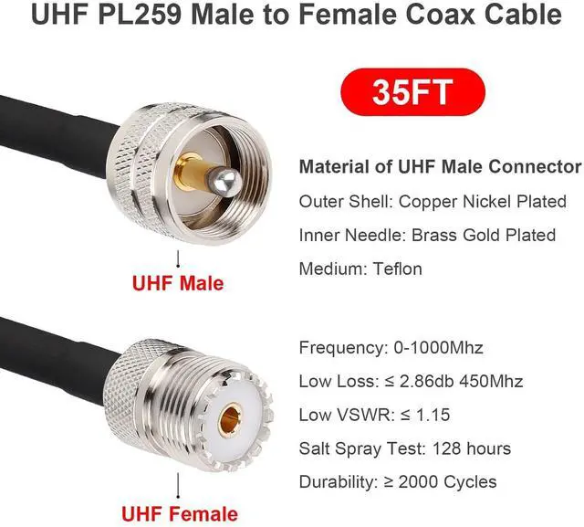 Impedance: 50 Ohm ^^ Ultra-Low Loss The braid of this cb coax cable is high-density tinned copper and 100% shield. The signal loss of this 35ft cb radio cable on 450MHZ is only 2.9 dB. SWR is 1.15 on 450MHZ. ^^ Durable Solidly Built This pl259 male to female cable is with the solid copper conductor. Flexible UV proof rf-pvc jacket, designed for outdoor exposure in harsh environments. It could be better in resist oxidation and corrosion than other uhf pl259 cables. ^^ Prevent Coming Off PL259 cb antennas cable connectors use adhesive-lined heat shrink to seal the cable to UHF connector after it's assembled. The connector is solid and professionally attached and no worried about connector pull out. ^^ Applications This cb coax cable could be used for cb ham radio, HF amateur radio, marine boat VHF radio, swr meter, surge protector, Walkie Talkies and etc. We provide 12 months guarantee to every customer, please contact us if there is any problem.