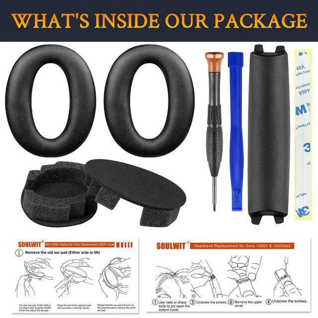 SOULWIT Replacement Kit for Sony WH-1000XM2 (WH1000XM2) & MDR-1000X (MDR1000X) Headphones, Ear Pads Cushions + Headband Replacement Headstrap Pad Repair Part - Black
