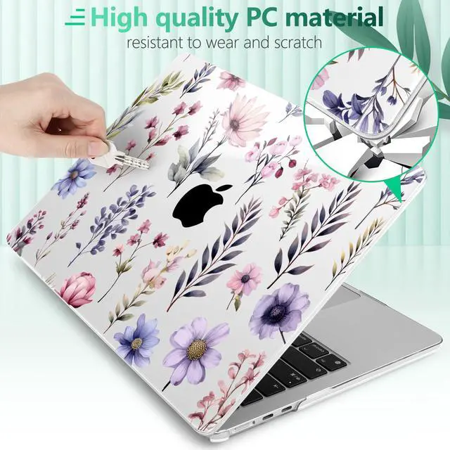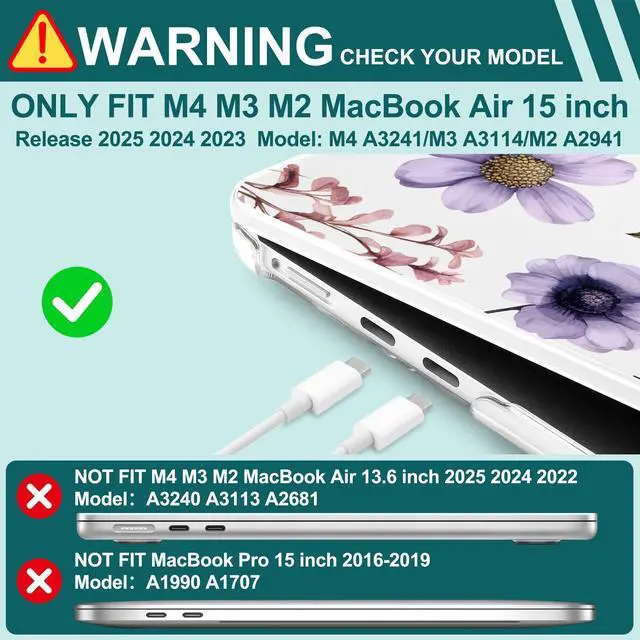 Compatible With - Only for M5/M4/M3/M2 MacBook Air 15 inch 2026 2025 2024 2023 (Only compatible model: A3448/A3241/A3114/A2941). Please confirm the model on the bottom of the MacBook before ordering ^^ Durable Material - MacBook Air 15-inch case is made of hard PC material, effective anti-slip/shockproof/anti-scratch etc ^^ Case Design - The case adopts the top and bottom case separation design, easy to install and remove ^^ Case Port Design - Precise cutouts allow full access to all ports, features, buttons, and Touch ID functionality ^^ Package - Included 1 MacBook Air 15 inch Case, 1 Keyboard Cover, 1 Trackpad Protector, 2 OTG Adapter