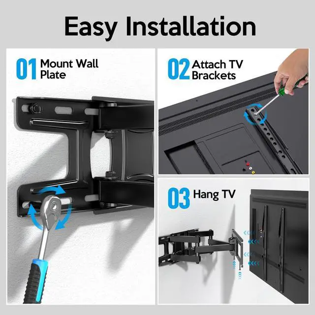 Three steps: 1)Install the wall plate, including the arms and TV plates. 2)Attach two brackets to TV back. 3)Hang two brackets together with TV onto the TV plate on wall. ^^ Safe and Sturdy TV Mount - Our TV brackets are designed, produced and tested with the highest international standards. Heavy duty steel construction with powder-coated black finish offers a smooth surface and robust look while providing strength and stability. ^^ Customer Service - Innovation, quality and first-class service is our ongoing goal. If you have any pre-purchase and installation questions, please feel free to contact us anytime. We will reply in 24 hours.