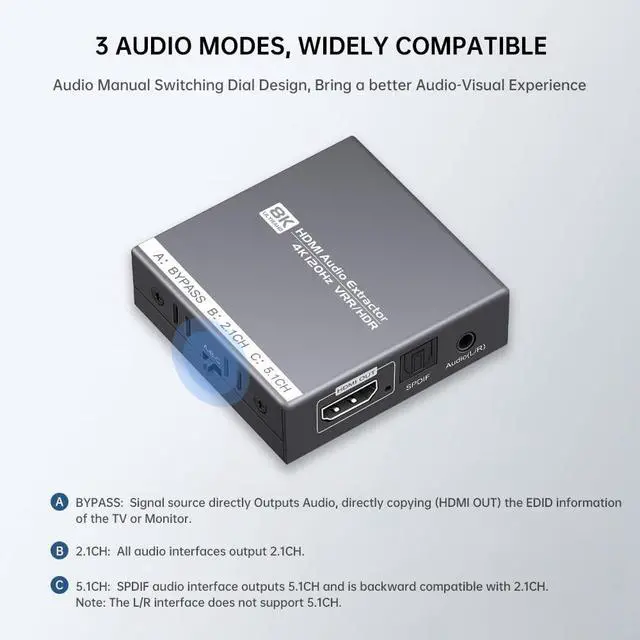 HDMI Audio Extractor 4K@120Hz/8K@60HzThe HDMI 2.1 audio extractor extracts audio information from HDMI signals and transmits it to audio receivers such as soundbars, amplifiers, headphones, and other audio receivers through optical SPDIF and AUX 3.5 mm interfaces.
