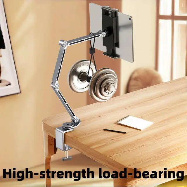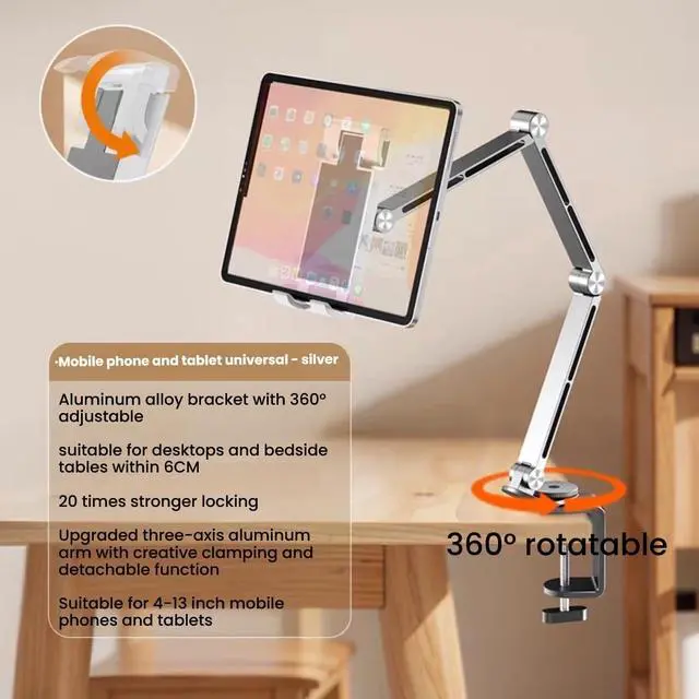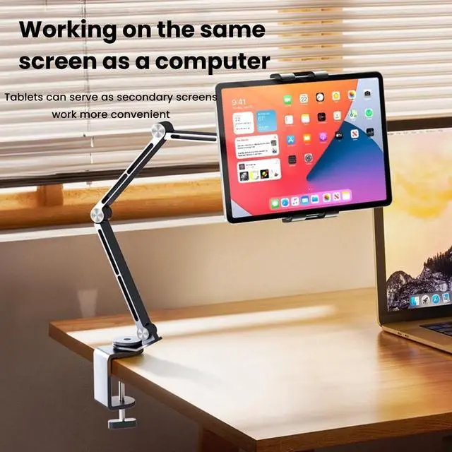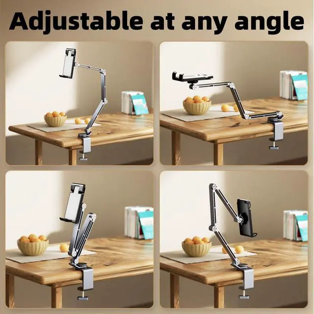 [Multi Joint Adjustable Design]Features multiple articulating joints, allowing for flexible adjustment of height, angle, and extensionto achieve the perfect viewing position for tablets or phones. ^^ [Wide Compatibility]Can securely hold various tablets and phones, accommodating different device sizes for versatile use in home, office, or creative studio settings. ^^ [Sturdy Clamp Base]Comes with a robust clamp that firmly attaches to desks (with a suitable clamping range as indicated by dimensions), ensuring stable support without slipping or wobbling. ^^ [Ergonomic & Space - Saving]Helps reduce neck and shoulder strain by enabling ergonomic device positioning, while its sleek, extended - arm design saves desktop space and keeps the workspace organized.