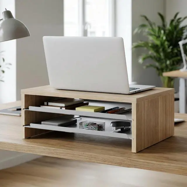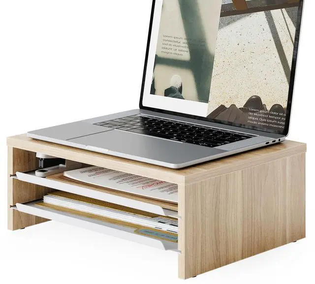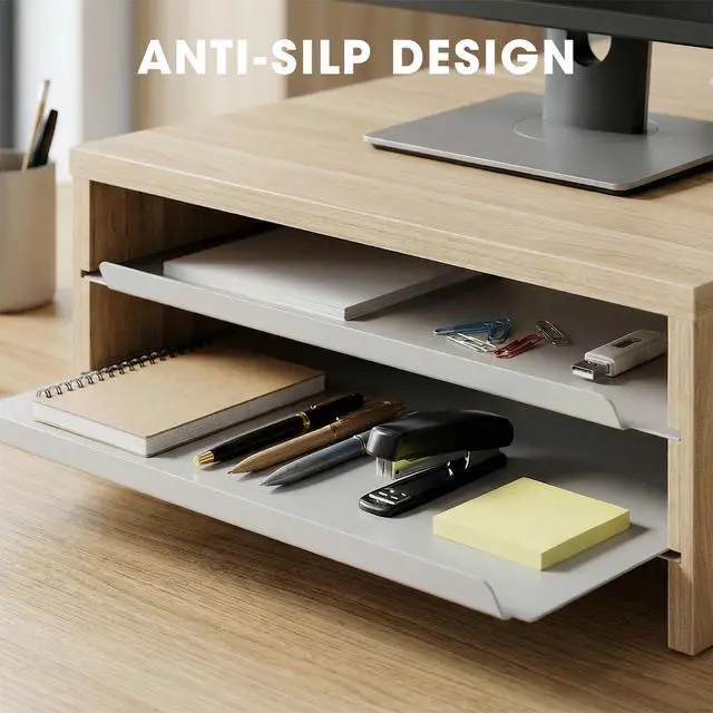 3 Tier Desk Stand Equipped with two sliding metal trays, Fenge monitor stand for desk allows instant access to USB drives, notebooks, and other small items. It helps free up to 30% of your desk space, transforming your workspace into a clean, minimalist zone in seconds. ^^ Ergonomic DesignRaises your screen by 5.3 inches, guiding your sight to a natural 15 downward tilt. This monitor riser promotes a proper 90 alignment between your neck and back, reducing slouching and neck strainideal for long hours of work or online classes.