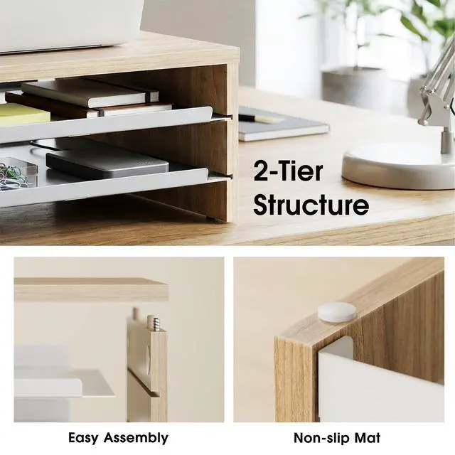^^ Sturdy & Slip-Resistant Crafted from premium MDF panels and rust-resistant metal shelves, this computer stand ensures stable typing without wobbling. Reinforced corners with silicone pads protect your desk from scratches. Tested to hold up to 44 lbs/20 kg, it remains durable and warp-resistant over time. ^^ Versatile Desk ShelfFeaturing 14.3 -inch wide, this desk riser functions as a laptop stand, printer stand, and desktop organizer. It adapts to various scenarios like office work and study, easily organizing your desktop devices. ^^ 3 Step Quick AssemblyWith pre-drilled holes, setup