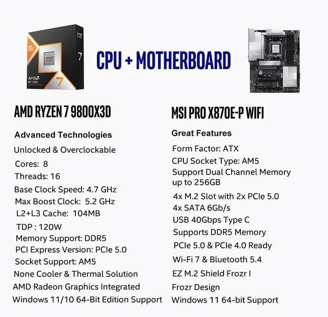 OS Support: Windows 11/ 10-64-Bit Edition. Cooler & Thermal Solution (PIB) not included. AMD Radeon Graphics Integrated ^^ MSI PRO X870E-P WiFi Motherboard, ATX Form Factor, Socket AM5, Supports Dual-Channel Memory DDR5 up to 256GB, PCIe 5.0 x 16 Support, 2x PCIe 5.0 x4 M. 2 Slot, 2x PCIe 4.0 x4 M. 2 Slot, 4x SATA 6GB/s, USB 40Gbps/20Gbps Type C, Wi-Fi 7, Bluetooth 5.4, Support for Windows 11 64-bit ^^ The PRO X870E-P WIFI employs a 14 Duet Rail Power System (60A, SPS) VRM for the AMD X870 chipset (AM5, Ryzen 9000 / 8000 / 7000) with Core Boost architecture; / FROZR GUARD - Excellent cooling features such as 7W/mK MOSFET thermal pads, extra choke thermal pads and an Extended Heatsink; Includes chipset heatsink, EZ M. 2 Shield Frozr II, a Combo-fan (for pump & system) header (3A) ^^ DDR5 MEMORY, PCIe 5.0 x16 SLOTS - 4 x DDR5 DIMM SMT slots enable extreme memory overclocking speeds (1DPC 1R, 8200+ MT/s OC); 1 x PCIe 5.0 x16 SMT slot (128GB/s) with Steel Armor supports cutting-edge graphics cards; / TRIPLE M.