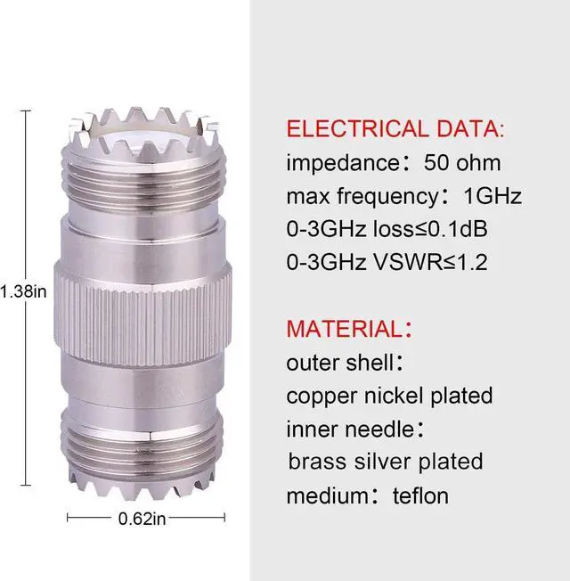 SO-239 to SO-239 Adapter Designed to connect two PL-259 male connectors, this UHF female-to-female coupler is ideal for extending RF coaxial cables in ham radios, CB radios, antennas, and other RF applications. ^^ Premium Signal Transmission Built with a silver-plated copper inner pin, ensuring excellent conductivity and minimal signal loss for superior RF performance. ^^ Corrosion-Resistant & Durable The tin-plated copper exterior enhances durability and resists oxidation, making it suitable for both indoor and outdoor setups. ^^ Easy to Use & Install No special tools required! Simply screw the adapter onto existing PL-259 male connectors for a quick and secure connection.