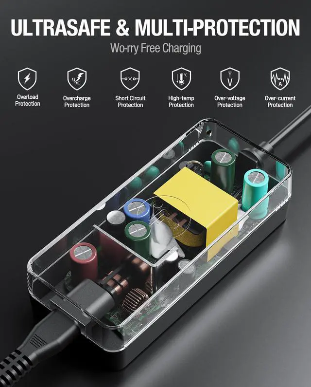 Input: 100240V AC, 50/60Hz. Built-in EMI suppression module to reduce electromagnetic interference. ^^ SAFE PROTECTIONS - Short-circuit Protection, Over Voltage Protection, Over Temperature Protection, Overload Protection, Overcurrent Protection ^^ IMPORTANT NOTE - The adapter may become warm during use, especially after extended charging, which is normal for high-power charging devices. Designed with multiple built-in safety protections, it automatically regulates temperature to ensure safe and reliable operation. For best performance, we recommend placing the charger on a well-ventilated, heat-resistant surface while charging. If the charger becomes unusually hot, please stop using it and contact us for a free replacement. ^^ WORRY-FREE SUPPORT Designed for reliable, long-term use. This AC/DC ADAPTER comes with a 30-day free return policy and 1-year warr-anty. Our support team is available 24/7, ready to assist you whenever needed.